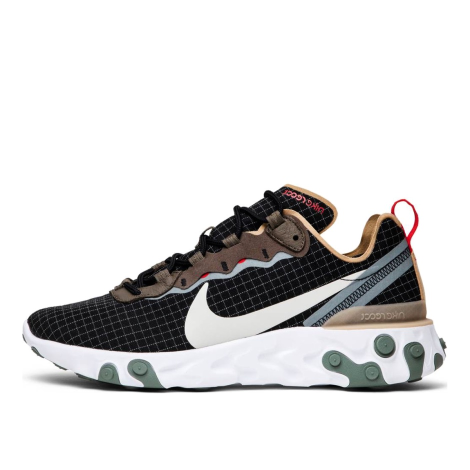Κυκλοφόρησε τον Νοέμβριο του 2018, το Nike X Size React στοιχείο 55 γκρι άμμος έρχεται ντυμένο με μαύρο, γκρι και αμμώδες χρώμα εμπνευσμένο από Windrunner, Lahar και Air Force Iii από το πακέτο διαφυγής. το μαύρο νάιλον επάνω μέρος Ripstop με μοτίβο σε λευκό πλέγμα εγγυάται ότι θα ευχαριστήσει το βλέμμα, ενώ το καφέ δέρμα και το σουέτ στη δαντέλα δίνουν μια κορυφαία πινελιά στο Sneaker. η γλώσσα και η γλωττίδα της φτέρνας είναι χρωματισμένα σε κόκκινο για επιπλέον χρώμα. τώρα διαθέσιμο στο Klekt.